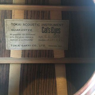 濃い茶色の独特なボディカラーでマーティンD41風のヘキサゴンインレイ、トーチインレイ、ボディトリム、ゴールドペグ等豪華な装飾で状態も奇麗な80年代のキャッツアイCE450Dです。