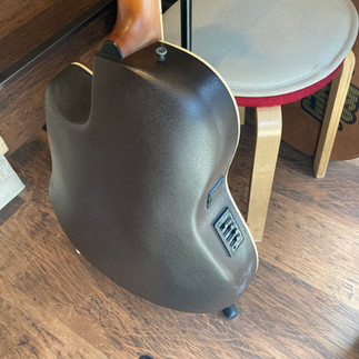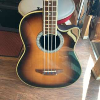 ラベルの型式を見るのを忘れていましたが、オベーションのエレアコベースですがボディーの中でコロコロと何か音がしておりまして多分ブリッジを止めているナットか何かが外れているのではないかと推測しますが、それともう少し弦高を下げて弦も交換して欲しいとの事だったのでお預かりしました。