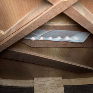 ブリッジを剥がす前に弦を外してボディ内を掃除しているとⅩブレーシングが割れておりましたがボディからは外れておりませんでした。