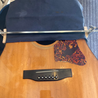 サドルを外すとプラスチックだったのでこれは牛骨に作り替えて、オーナーさんが気にされていたピックガード横のクラックはボディサイドを押さえてタイトボンドで広がらないように処置しておきました(クラックの後ろ側に丁度補強がされているのでこれ以上は広がらないと思われます)