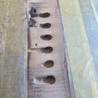 ヘッドサイド両面の木ねじ周辺から亀裂が診られたのでこれも修理します。