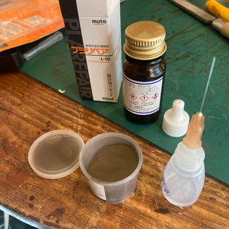 壊れた4弦のペグボタンをプラスチックの修復に良いとうわさで聞いたプラリペアを使って何とか修復してみました(プラスチックの細かなパウダーに溶液を加えて割れた箇所に塗布してプラスチックを修復させます)