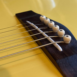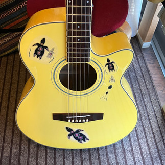 アコギでは珍しい鮮やかなイエローカラーに可愛い亀のステッカーがトロピカルな雰囲気が出ていて、コンパクトなボディサイズにカッタウェイ加工されたマルチネスは楽に弾けてピックアップも搭載されていて、程よい鳴りのアコギでございました。